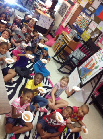 We started the day by preparing our homemade applesauce and then enjoyed eating our applesauce for snack (see recipe below)! It made the room smell WONDERFUL!!! 18 students liked the applesauce and 2 students did not like it but they tasted it. We also traveled around the world with "How to Make an Apple Pie and See the World". We used google earth to travel to the different places from the story. We were worn out afterwards because we visited England, Italy, Jamaica, Sri Lanka, and Vermont. :)